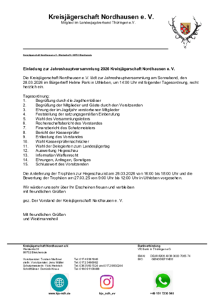 Einladung zur Jahreshauptversammlung 2026 Kreisjägerschaft Nordhausen e. V.
