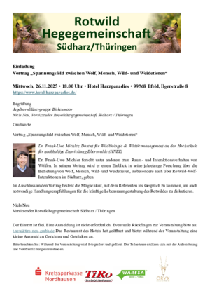 Am 12.9.25 fand die die Mitgliederversammlung des Thüringer Rotwildrings Rennsteig-Vorderrhön statt. Mit dabei waren Herr Collmann…