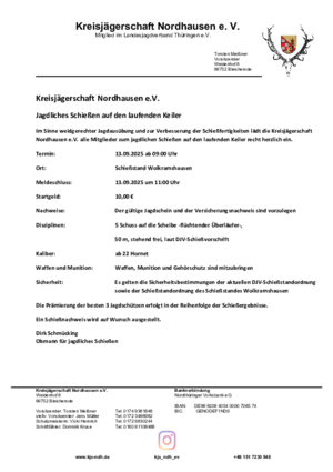in der Anlage finden Sie die Auschreibung zur Brauchbarkeitsprüfung der Kreisjägerschaft Nordhausen e.…
